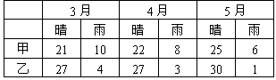 甲、乙兩城市分別在我國(guó)東部和西部,3-5月份晴天,雨天的統(tǒng)計(jì)如下表: