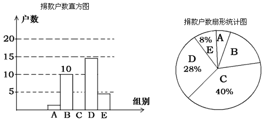 | 2008年5月12日汶川大地震,地震災(zāi)情牽動(dòng)全國人民的心,某社區(qū)積極組織居民為災(zāi)區(qū)捐款,并對部分捐款戶數(shù)進(jìn)行分組統(tǒng)計(jì)(統(tǒng)計(jì)表如下),還將數(shù)據(jù)整理成如圖所示的統(tǒng)計(jì)圖(不完整),已知A、B兩組捐款戶數(shù)直方圖的高度之比為1:5,請結(jié)合圖中相關(guān)數(shù)據(jù)回答下列問題: | ||||||||||||