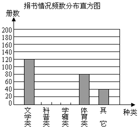 | 城關(guān)中學(xué)開展的“我為四川地震災(zāi)區(qū)獻(xiàn)愛心”捐書活動中,校團(tuán)委為了了解九年級同學(xué)的捐書情況,用簡單的隨機(jī)抽樣方法從九年級的10個(gè)班中抽取50名同學(xué),對這50名同學(xué)所捐的書進(jìn)行分類統(tǒng)計(jì)后,繪制了如下統(tǒng)計(jì)表: | ||||||||||||||