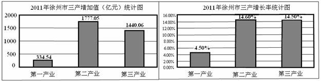 2011年徐州市全年實(shí)現(xiàn)地區(qū)生產(chǎn)總值3551.65億元,按可比價格計算,比上年增長13.5%,經(jīng)濟(jì)平穩(wěn)較快增長。其中,第一產(chǎn)業(yè)、第二產(chǎn)業(yè)、第三產(chǎn)業(yè)增加值與增長率情況如圖所示: 根據(jù)圖中信息,寫成下列填空: