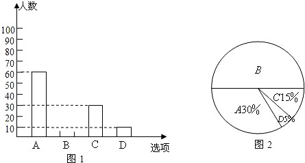 為了了解學(xué)生參加體育活動(dòng)的情況,學(xué)校對(duì)學(xué)生進(jìn)行隨機(jī)抽樣調(diào)查,其中一個(gè)問(wèn)題是“你平均每天參加體育活動(dòng)的時(shí)間是多少”,共有4個(gè)選項(xiàng):A、1.5小時(shí)以上;B、1~1.5小時(shí);C、0.5~1小時(shí);D、0.5小時(shí)以下.圖1、2是根據(jù)調(diào)查結(jié)果繪制的兩幅不完整的統(tǒng)計(jì)圖,請(qǐng)你根據(jù)統(tǒng)計(jì)圖提供的信息,解答以下問(wèn)題: