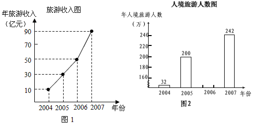某人為了了解他所在地區(qū)的旅游情況,收集了該地區(qū)2004至2007年每年的旅游收入及入境旅游人數(shù)(其中缺少2006年入境旅游人數(shù))的有關(guān)數(shù)據(jù),整理并分別繪成圖1,圖2,