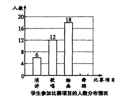哈市某中學(xué)為了豐富校園文化生活.校學(xué)生會(huì)決定舉辦演講、歌唱、繪畫、舞蹈四項(xiàng)比賽,要求每位學(xué)生都參加,且只能參加一項(xiàng)比賽.圍繞“你參賽的項(xiàng)目是什么?(只寫一項(xiàng))”的問題,校學(xué)生會(huì)在全校范圍內(nèi)隨機(jī)抽取部分學(xué)生進(jìn)行問卷調(diào)查。將調(diào)查問卷適當(dāng)整理后繪制成如圖所示的不完整的條形統(tǒng)計(jì)圖.其中參加舞蹈比賽的人數(shù)與參加歌唱比賽的人數(shù)之比為1:3,請你根據(jù)以上信息回答下列問題: