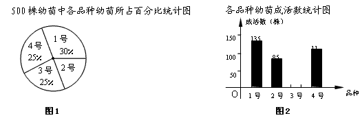 | 某生態(tài)示范園要對1號、2號、3號、4號四個品種共500株果樹幼苗進行成活實驗,從中選出成活率高的品種進行推廣,通過實驗得知,3號果樹幼苗成活率為89.6%,把實驗數(shù)據(jù)繪制成下列兩幅統(tǒng)計圖(部分信息未給出) |
