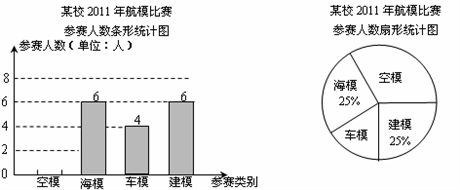 | “知識改變命運,科技繁榮祖國”.某市中小學每年都要舉辦一屆科技運動會.下圖為該市某校2010年參加科技運動會航模比賽(包括空模、海模、車模、建模四個類別)的參賽人數(shù)統(tǒng)計圖: |