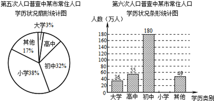 (2)第六次人口普查結(jié)果與第五次相比,該市常住人口中高中學(xué)歷人數(shù)增長的百分比是多少?