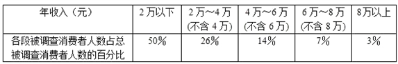 (1)被調(diào)查的消費者平均年收入為_________.(提示:在計算時,2萬元以下的都看成1萬元,2萬~4萬元的都看成3萬元,依此類推,8萬元以上的都看成9萬元)