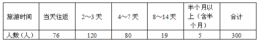 石家莊市旅游部門對(duì)2011年第一季度游客在某景區(qū)的旅游時(shí)間作抽樣調(diào)查,統(tǒng)計(jì)如下:若將統(tǒng)計(jì)情況制成扇形統(tǒng)計(jì)圖,則表示旅游時(shí)間為“2-3天( )。