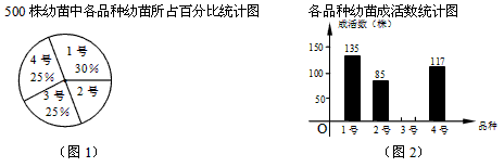 | 某生態(tài)示范園要對(duì)1號(hào)、2號(hào)、3號(hào)、4號(hào)四個(gè)品種共500株果樹幼苗進(jìn)行成活實(shí)驗(yàn),從中選出成活率高的品種進(jìn)行推廣,通過實(shí)驗(yàn)得知,3號(hào)果樹幼苗成活率為89.6%,把實(shí)驗(yàn)數(shù)據(jù)繪制成下列兩幅統(tǒng)計(jì)圖(部分信息未給出) |