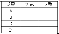 | 某校七年級一班50名同學最喜歡的NBA籃球明星的調查結果如下:其中:A代表姚明,B代表科比,C代表詹姆斯,D代表麥迪. (1)填表: |