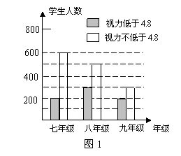 某學(xué)習(xí)小組對(duì)所在城區(qū)初中學(xué)生的視力情況進(jìn)行抽樣調(diào)查,圖1是這些同學(xué)根據(jù)調(diào)查結(jié)果畫出的條形統(tǒng)計(jì)圖.請(qǐng)根據(jù)圖中信息解決下列問(wèn)題: