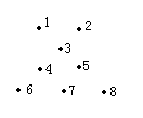 下圖是由8個(gè)釘組成的不規(guī)則釘陣,我們依次給它們編號(hào),分別為1,2,3,4,5,6,7,8。這1,3,5;2,3,4;6,7,8分別在一條直線上,用皮筋去套這些釘,一共可以套出多少個(gè)三角形?