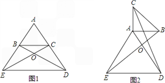 (2)△ADE的位置保持不變,將△ABC繞點(diǎn)A逆時(shí)針旋轉(zhuǎn)至圖2的位置,AD、BE相交于O,請(qǐng)你判斷線段BE與CD的關(guān)系,并說(shuō)明理由.