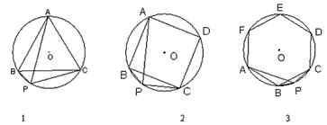 (1)已知:如圖1, 是⊙ O的內(nèi)接正三角形,點(diǎn)P為弧BC上一動(dòng)點(diǎn).求證:PA=PB+PC. (2) 如圖2,四邊形ABCD是⊙O的內(nèi)接正方形,點(diǎn)P為弧BC上一動(dòng)點(diǎn).求證: . (3)如圖3,六邊形ABCDEF是⊙O的內(nèi)接正六邊形,點(diǎn)P為弧BC上一動(dòng)點(diǎn),請(qǐng)?zhí)骄?IMG style="VERTICAL-ALIGN: middle" src="http://thumb.zyjl.cn/pic1/upload/papers/c02/20110114/20110114115535641993.gif">三者之間有何數(shù)量關(guān)系,并給予證明. |