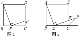 | 如圖1,在邊長為5的正方形ABCD中,點(diǎn)E、F分別是BC、DC邊上的點(diǎn),且AE⊥EF,BE=2。 (1)求EC:CF的值; (2)延長EF交正方形外角平分線CP于點(diǎn)P(如圖2),試判斷AE與EP的大小關(guān)系,并說明理由; (3)在圖2的AB邊上是否存在一點(diǎn)M,使得四邊形DMEP是平行四邊形?若存在,請給予證明;若不存在,請說明理由。 |