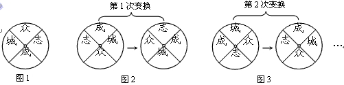 有一個(gè)四等分轉(zhuǎn)盤(pán),在它的上、右、下、左的位置分別掛著“眾”、 “志”、“成”、“城”四個(gè)字牌,如圖1。若將位于上下位置的兩個(gè)字牌對(duì)調(diào),同時(shí)將位于左右位置的兩個(gè)字牌對(duì)調(diào),再將轉(zhuǎn)盤(pán)順時(shí)針旋轉(zhuǎn)90°,則完成一次變換。圖2,圖3分別表示第1次變換和第2次變換。按上述規(guī)則完成第9次變換后,“眾”字位于轉(zhuǎn)盤(pán)的位置是