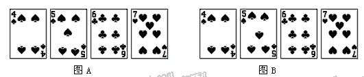 如果4張撲克按圖A的形式擺放在桌面上,將其中一張旋轉(zhuǎn)180°后,撲克的放置情況如圖B所示,那么旋轉(zhuǎn)的撲克從左起是