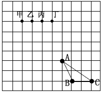 在方格紙(每個(gè)小方格都是邊長(zhǎng)為1個(gè)單位長(zhǎng)度的正方形)中,我們把每個(gè)小正方形的頂點(diǎn)稱(chēng)為格點(diǎn),以格點(diǎn)為頂點(diǎn)的圖形稱(chēng)為格點(diǎn)圖形,如圖中的△ABC稱(chēng)為格點(diǎn)△ABC,現(xiàn)將圖中△ABC繞點(diǎn)A順時(shí)針旋轉(zhuǎn)180°,并將其邊長(zhǎng)擴(kuò)大為原來(lái)的2倍,則變形后點(diǎn)B的對(duì)應(yīng)點(diǎn)所在的位置是