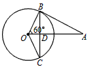 如圖,AB與⊙O相切于點(diǎn)B,線段OA與弦BC垂直于點(diǎn)D,∠AOB=60°,BC=4cm,則切線AB=( )cm。