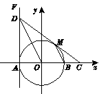 | 如圖,在平面直角坐標系xOy中,⊙O交x軸于A、B兩點,直線FA⊥x軸于點A,點D在FA上,且DO平行⊙O的弦MB,連DM并延長交x軸于點C. (1)判斷直線DC與⊙O的位置關系,并給出證明; (2)設點D的坐標為(-2,4),試求MC的長及直線DC的解析式. |