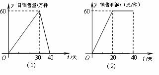 某公司專銷產(chǎn)品A,第一批產(chǎn)品A上市40天內(nèi)全部售完.該公司對第一批產(chǎn)品A上市后的市場銷售情況進(jìn)行了跟蹤調(diào)查,調(diào)查結(jié)果如圖所示,其中圖(1)中的折線表示的是市場日銷售量與上市時(shí)間的關(guān)系;圖(2)中的折線表示的是每件產(chǎn)品A的銷售利潤與上市時(shí)間的關(guān)系.