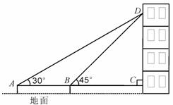 在我市迎接奧運圣火的活動中,某校教學(xué)樓上懸掛著宣傳條幅DC,小麗同學(xué)在點A處,測得條幅頂端D的仰角為30°,再向條幅方向前進10米后, 又在點B處測得條幅頂端D的仰角為45°,已知測點A、B和C離地面高度都為1.44米,求條幅頂端D點距離地面的高度.(計算結(jié)果精確到0.1米, 參考數(shù)據(jù):