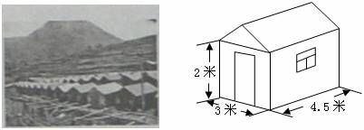 為支援四川災(zāi)區(qū),綠野橡膠篷布廠承接了一批活動房式帳篷的生產(chǎn)任務(wù),蓬面使用的是PVC雙面涂塑蓬布,帳篷的外部結(jié)構(gòu)和規(guī)格尺寸如圖所示(帳篷頂部兩個斜面的坡度相同,頂部最高點到地面的距離為2.65米).制作一頂這樣的帳篷,至少需要 平方米的PVC雙面涂塑蓬布(帳篷的門、窗都需要蓬布.接縫等忽略不計,計算結(jié)果精確到1平方米).