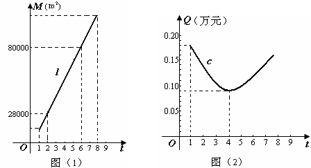 ,為充分利用土地資源,更好地解決人們的住房需求,并適當?shù)目刂平ㄖ锏母叨龋话愕厝莘e率t不小于1且不大于8.一房地產(chǎn)開發(fā)商在開發(fā)某小區(qū)時,結(jié)合往年開發(fā)經(jīng)驗知,建筑面積M(m2)與容積率t的關(guān)系可近似地用如圖(1)中的線段l來表示;1 m2建筑面積上的資金投入Q(萬元)與容積率t的關(guān)系可近似地用如圖(2)中的一段拋物線段c來表示.