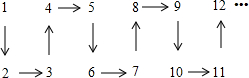 將正整數(shù)1,2,3,4,5,…,按如圖方式擺放:則根據(jù)擺放規(guī)律,從2012到2013的箭頭為