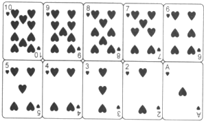 如圖是撲克牌中紅桃A~紅桃10,這10張牌中屬于中心對(duì)稱圖形的是