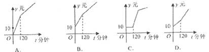 某電信部門為了鼓勵(lì)固定電話消費(fèi),推出新的優(yōu)惠套餐:月租費(fèi)10元;每月拔打市內(nèi)電話在120分鐘內(nèi)時(shí),每分鐘收費(fèi)0.2元,超過(guò)120分鐘的每分鐘收費(fèi)0.1元;不足1分鐘時(shí)按1分鐘計(jì)費(fèi).則某用戶一個(gè)月的市內(nèi)電話費(fèi)用y(元)與拔打時(shí)間t(分鐘)的函數(shù)關(guān)系用圖象表示正確的是( )