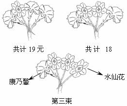 教師節(jié)來臨之際,群群所在的班級準(zhǔn)備向每位辛勤工作的教師獻(xiàn)一束鮮花,每束由4支鮮花包裝而成,其中有象征母愛的康乃馨和象征尊敬的水仙花兩種鮮花,同一種鮮花每支的價(jià)格相同.請你根據(jù)第一、二束鮮花提供的信息,求出第三束鮮花的價(jià)格.