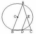 已知:如圖,等腰三角形ABC中,AB=AC=4,若以AB為直徑的⊙O與BC相交于點(diǎn)D,DE∥AB,DE與AC相交于點(diǎn)E,則DE=____________。