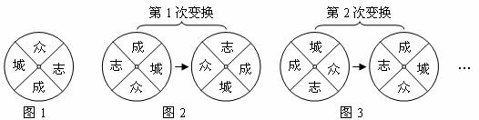 有一個(gè)四等分轉(zhuǎn)盤,在它的上、右、下、左的位置分別掛著“眾”、“志”、“成”、“城”四個(gè)字牌,如圖1.若將位于上下位置的兩個(gè)字牌對(duì)調(diào),同時(shí)將位于左右位置的兩個(gè)字牌對(duì)調(diào),再將轉(zhuǎn)盤順時(shí)針旋轉(zhuǎn)