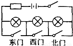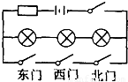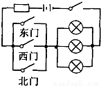 在C中,斷開東、西、北門任何一個(gè)開關(guān),都不影響三個(gè)燈泡正常發(fā)光,故C不和題意.