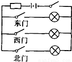 在B中,東、西、北門有一個(gè)開關(guān)斷開,不影響燈泡的發(fā)光,都閉合時(shí),三個(gè)都不發(fā)光,斷開東、西、北門任何一個(gè)開關(guān),燈泡都正常發(fā)光,故B不合題意.