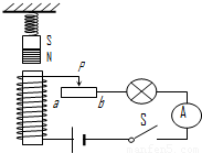如圖所示,在電磁鐵正上方用彈簧掛著一條形磁鐵,當(dāng)開關(guān)S閉合后,且滑片P從a端向b端滑動過程中,會出現(xiàn)的現(xiàn)象是小燈飽亮度 (選填“增強(qiáng)”或“減弱”),彈簧長度 (選填“變長”或“縮短”)。![]()