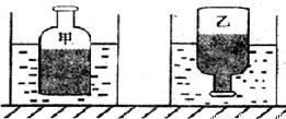 在兩個相同的薄壁塑料瓶(質(zhì)量忽略不計)內(nèi)分別裝入體積相等、密度為ρ甲和ρ乙的兩種液體后密封,再把它們放入兩個裝有水的容器中,處于如圖狀態(tài)。下列判斷正確的是 ( )![]()