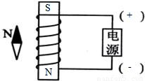 【答案】分析:由小磁外的指向可知該點的磁場方向,則由外部磁感線的特點可知螺線管的磁極,則由右手螺旋定則可知電流的方向及電源的正負(fù)極.