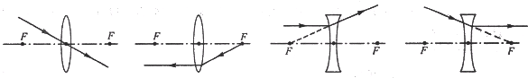 (4)對于凹透鏡,指向另一側(cè)焦點的光線經(jīng)凹透鏡折射后折射光線平行于主光軸,如圖所示: