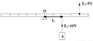 以O(shè) 為支點(diǎn)質(zhì)量忽略不計(jì)的杠桿掛上10N 重物A,杠桿同時(shí)還受另一個(gè)大小與FA不等、豎直向上的力FB作用,處于平衡。在圖中畫出