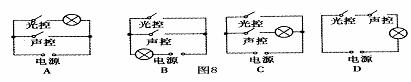 樓道里,科研人員利用光敏材料制成“光控開(kāi)關(guān)”,天黑時(shí)自動(dòng)閉合;天亮?xí)r自動(dòng)斷開(kāi),利用聲敏材料制成“聲控開(kāi)關(guān)”,當(dāng)有人走動(dòng)發(fā)出聲音時(shí),自動(dòng)閉合;無(wú)人走動(dòng)時(shí),自動(dòng)斷開(kāi),若將這兩個(gè)開(kāi)關(guān)配合使用(如圖8),就可以使樓道燈變得“智能化”,這種“智能”電路正確的是( )