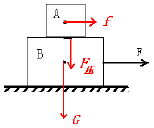 如圖所示,A 物體放置在B 物體上,A 物體隨著B 物體在外力F 的作用下,由靜止開始運動。請畫出A 物體所受摩擦力f 和B物體所受重力G 及A 物體對B 物體壓力的示意圖 (其中G>f)。
