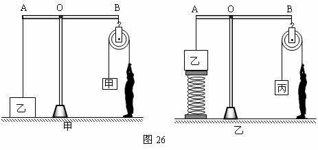 若用物體丙替換物體甲,并在物體乙的下方連接一個(gè)彈簧,如圖26乙所示,當(dāng)輕桿AB在水平位置時(shí),整個(gè)裝置處于平衡狀態(tài),彈簧對(duì)物體乙的作用力為F2=780N。求:⑵此時(shí)地面對(duì)人的支持力F3。