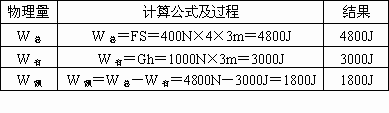 一位工人師傅用如圖所示的滑輪組提起重1000N的物體,若工人用400N的拉力在1min內(nèi),將這個(gè)物體提高3N.請(qǐng)你才算出除物體及繩端運(yùn)動(dòng)速度、繩端移動(dòng)距離之外,與這個(gè)滑輪組做功過(guò)程有關(guān)的任意三個(gè)物理量,井把計(jì)算過(guò)程及結(jié)果填入下表中.