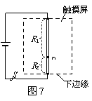 電阻觸摸屏在手機已普遍使用,當(dāng)手指在觸摸屏表面施以一定的壓力時,觸摸屏通過分別識別觸摸點的水平與豎直位置,從而確定觸摸的位置。以豎直方向為例,觸摸屏相當(dāng)于一根電阻絲,觸摸時,觸摸點P將電阻絲分為上下兩部分,設(shè)上部分電阻為R1,下部分電阻為R2,結(jié)構(gòu)可等效為如圖7所示電路,電源電壓不變。當(dāng)觸摸點在豎直方向移動時,若測得R2兩端電壓增大,則R2 ,觸摸點P到屏下端的距離 (均選填“增大”“減小”或“不變”)。