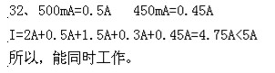 、 某家庭電路中有冰箱、彩電、洗衣機各一臺、兩盞燈,這些用電器之間都是并聯(lián)的, 工作電流分別為2A、500mA、1.5A、0.3A、450mA。若干路總電流不允許超過5A,通過計算回答, 這些用電器能否同時工作?