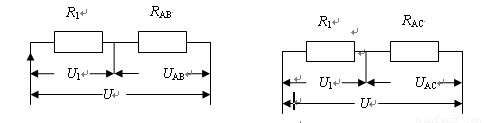 如圖所示,電源電壓保持不變,電阻R1的阻值為20Ω。 當滑片P在滑動變阻器的B端時,電壓表的示數(shù)為3V;當滑片在滑動變阻器的中點C時,電壓表的示數(shù)為2V。求:(1)電路兩端的電壓U;(2)滑動變阻器的最大阻值RAB。(要求每個狀態(tài)分別畫出對應的電路圖)