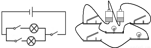 解答:解:兩電池串聯(lián),兩燈泡并聯(lián),左邊兩個開關(guān)分別控制其中一條支路,右邊開關(guān)在干路上控制整個電路,如右圖所示;電流從正極出發(fā),流經(jīng)右邊開關(guān)后開始分支,一支經(jīng)上面燈泡和開關(guān),另一支經(jīng)燈泡和開關(guān),然后合到一塊回到電源的負極,如左圖所示: