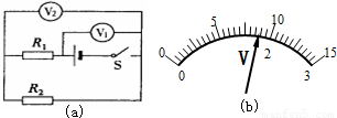在圖(a)所示電路中,V1、V2都是有0~3V和0~15V兩個(gè)量程的電壓表.當(dāng)閉合開關(guān)后,兩個(gè)電壓表指針偏轉(zhuǎn)均如圖(b)所示,若電路正常,電阻R1、R2兩端的電壓分別為